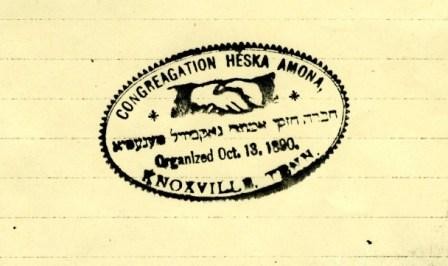 The transliteration of the Hebrew letters apparently was intended to read “Chevre Hezke Amunah [or Amonah], Noksvil, Tenesee” [for non-Hebrew & Yiddish readers, the same Hebrew letter may be used for both ‘oh’ {Amona} and ‘oo’ {Amuna} sounds], but careful scrutiny of the letters suggests that what should be the samekh [s] of “Noksvil” may have been the similarly-shaped mem [m]. Readers will likely disagree on what the first letter of “Tenesee” is, and someone more knowledgeable than the Archivist may be able to explain that aleph at the end of “Tenesee.”