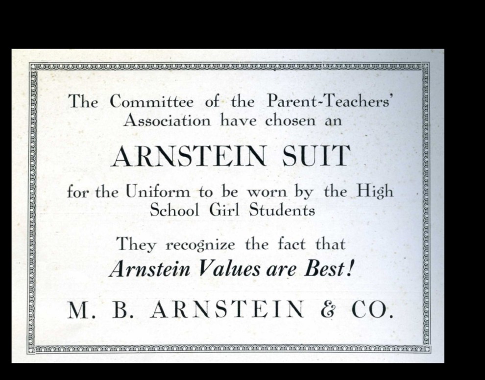 1920's Notice commending M. B. Arnstein & Co. which appeared in the Knoxville High School annual, the Voice, 1920. Max and Lalla Arnstein, benefactors of Temple Beth El and the Jewish Community Center (renamed after their passing as the Arnstein Jewish Community Center) and other institutions, lived in Knoxville from the early 1900’s until 1929. Their portraits hang in the AJCC. The seven-story Arnstein Building, at the corner of Union and Market Streets, was Knoxville’s tallest building when completed in 1906. The Arnstein store was considered one of the finest department stores in the South. Today the building houses Urban Outfitters, BarberMcMurray Architects, and twenty apartments.