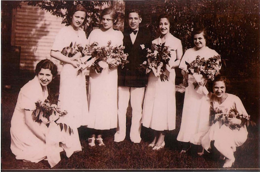 From left: Rosa B Allen (married Alfred Stillpass), Ida Goodstein (married Sid Jervis), Rosie Cooper (married Zeke Frumin), Louis Glazer, Lena Collins (married Lewis Loef), Bertha Kaplan (married first Leo Gerson and second Louis Morris), Virginia Joffe (married Sam Morrison).
