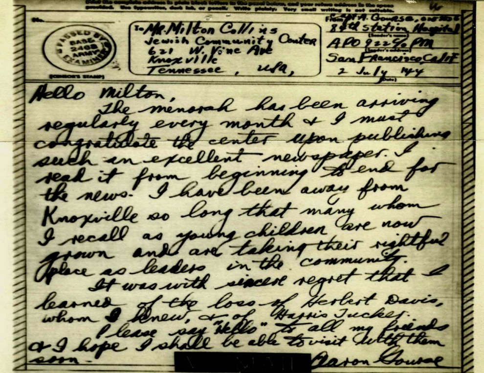 This letter from Aaron Gourse to Milton Collins is a sample of the more than 1500 documents and photos in our local collection. Nearly 100 servicemen wrote to Collins, the Jewish Community Center director from 1942 to 1963, over the course of their military service during and after World War II, when they received issues of the JCC’s monthly publication, The Center Menorah. Milton saved every letter, and after his death his family saved the letters, eventually donating them to the KJA Archives. The Archives also houses the Center’s Jewish Welfare Board cards for the servicemen and their military address cards. Aaron’s JWB card states that he enlisted in November of 1942 as a first lieutenant.