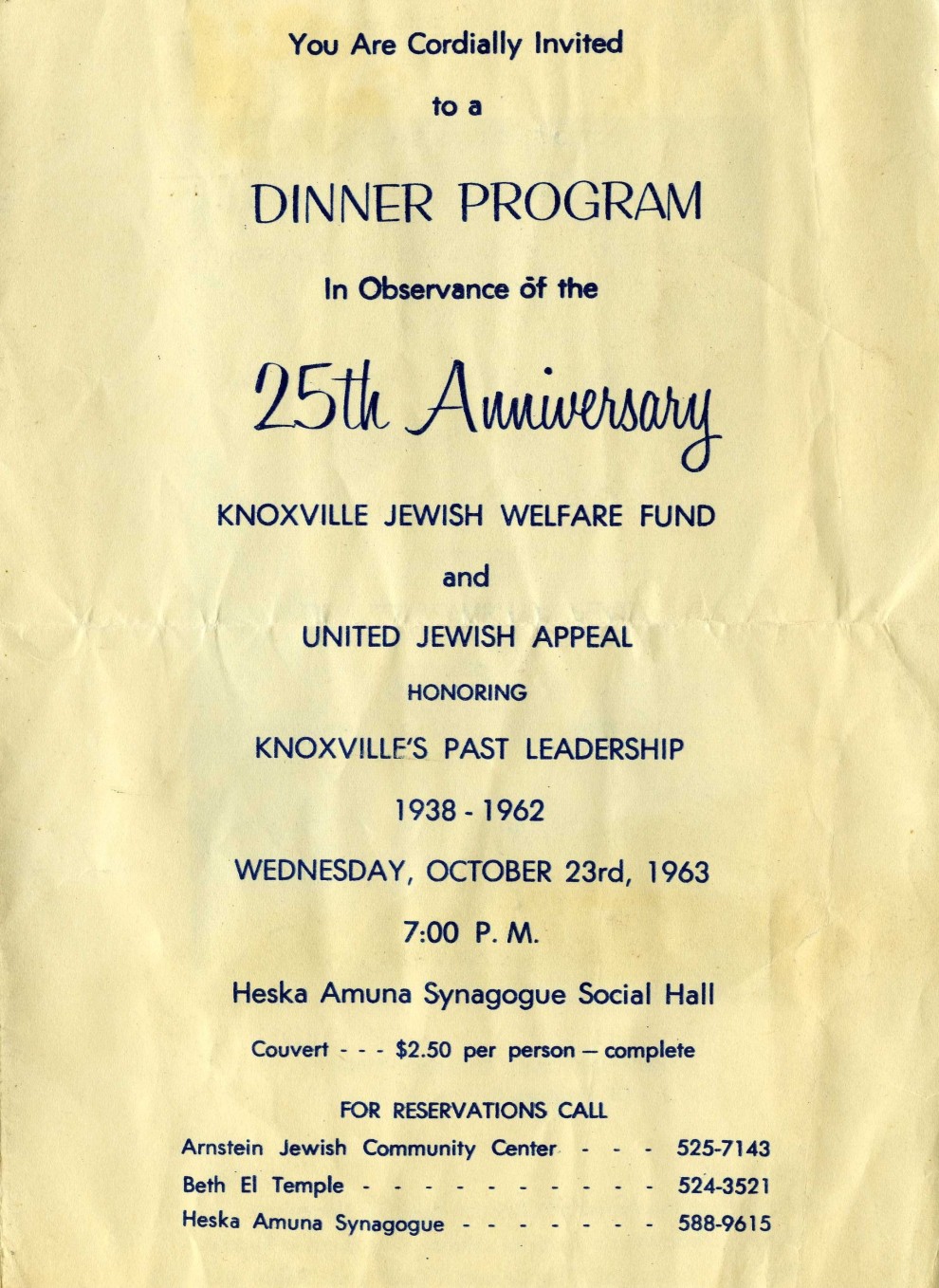 While it was billed as a 25th anniversary dinner, the KJWF actually was a successor organization to the first organized Knoxville fund, the Knoxville Federation of Jewish Charities.