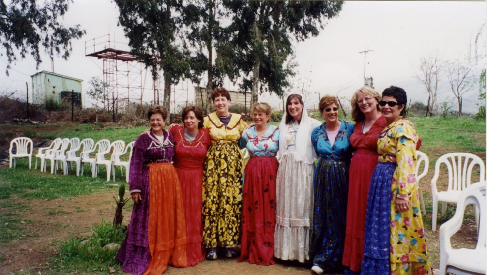 Dressed for a wedding at an Arab village, some of the members of KJF’s Mission to Israel in April of 2000. From left to right: Judy Megibow, Judy Brietstein, Marilyn Abrams, Susan Silber, Deborah Oleshansky, Susan Gardberg, Pam Gross, the late Leslie Munzer. Judy Brietstein, Marilyn Abrams, Susan Silber, Deborah Oleshansky, and Pam Gross continue to live in Knoxville. Susan Gardberg, who lives in Savannah, was one of the non-Knoxvillians among the 29 mission participants.