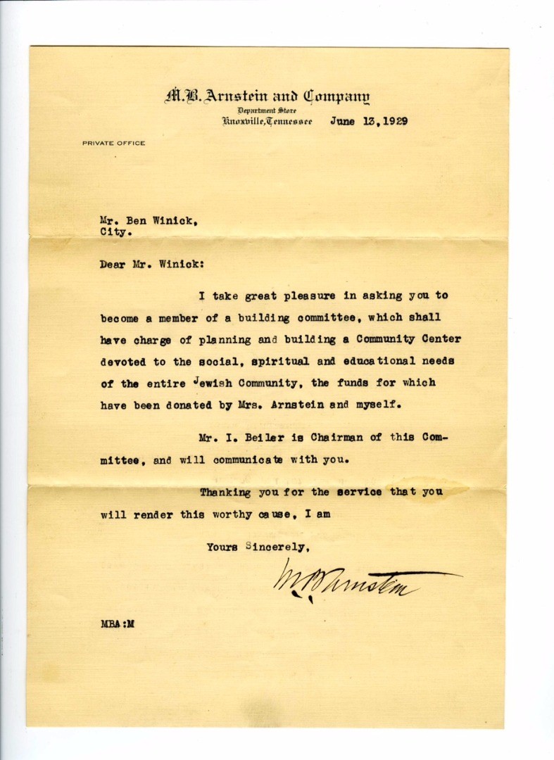 This letter was written shortly before Max and Lalla Arnstein left Knoxville and moved to New York City, though they remained benefactors of the Knoxville Jewish community. I. Beiler was Isidore Beiler, an active member of Temple Beth El. Ben Winick was an attorney and a member of Heska Amuna Synagogue. Ben’s daughter, Barbara Winick Bernstein, is the third generation of the Winick family to be actively involved in the Knoxville Jewish community.