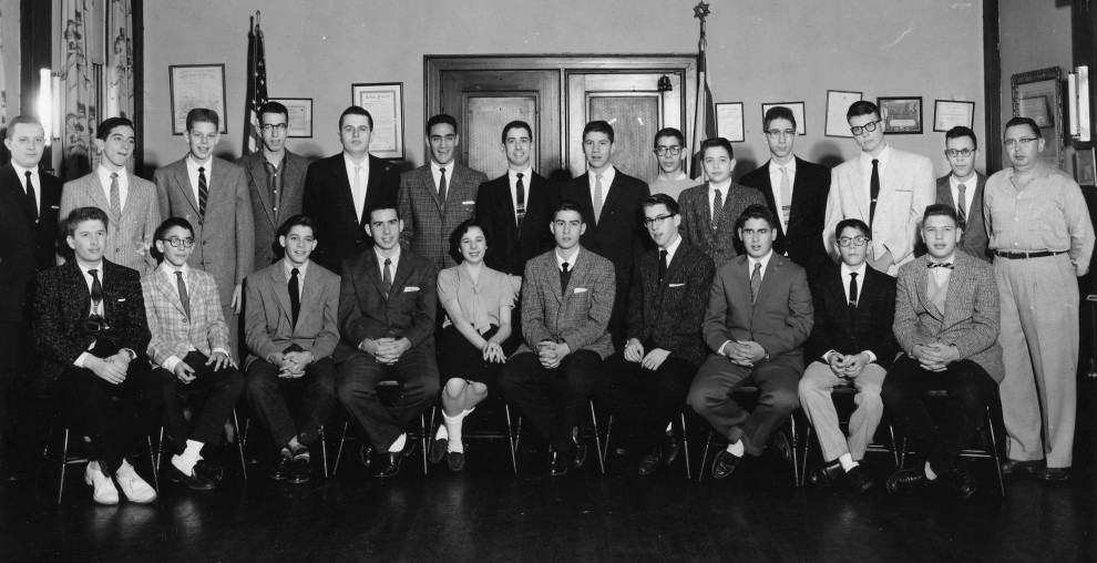 Back row, left to right: the late Arnold Schwarzbart, Norman Slovis, Alan Schwartz, Ivan Brody, David Leeds, Arnold Cohen, David Silver, Herbie Jacobs, Jerry Winston, Michael Brownstein, Norman Busch, Roger Davis, Charles Konigsberg, Sam Freeman.