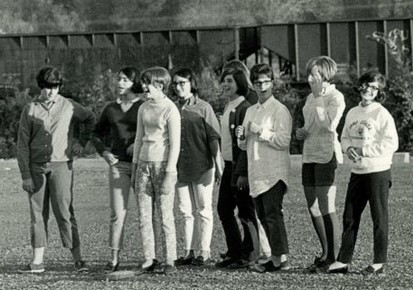 Here, left to right: Caren Millen (now Wayburn), Suzy Winston (now Young), Gwen Lunden, Randy Robinson (now Rabbi Geela Rayzel Raphael), the late Merryl Ross (later Thornton), Susan Millis, Elaine Tobe (now Hines), Deborah Bush {now Roberts). Behind Merryl, barely visible, is Sherry Siegel.