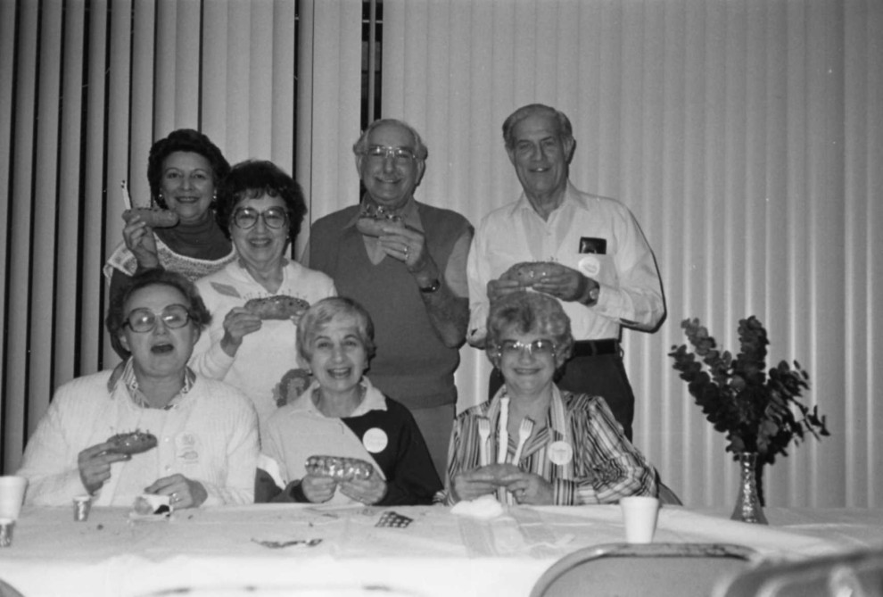 This photo appeared in the April, 1987, issue of The Center Menorah, where the caption began “The Menorah had to save this picture of the 39ers displaying their creativity until there was room,” so this photo was taken at least a month or two before that. The 39ers was the name for a popular adult group which met monthly at the Center during the 1980’s.