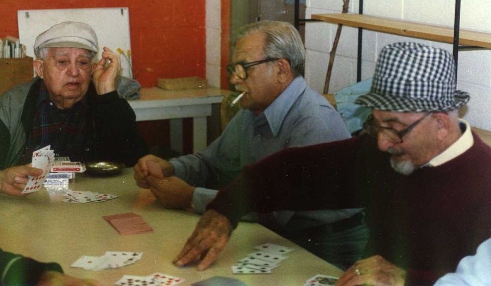 Dave Cohen (1902-1989), Buddy Cohen (1913-1990), and Max Weinstein (1900-1993) play poker at the AJCC in March of 1988. Dave was the husband of Molly Slovis, whose nieces Esther Webster and Nita Merlin reside in Knoxville. Buddy was the father of Arnold Cohen, and Max was the grandfather of Doug and Jeff Weinstein, who continue to live in Knoxville.