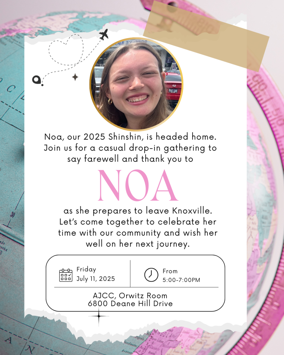 Noa, our 2025 Shinshin, is headed home. Join us for a casual drop-in gathering to say farewell and thank you to Noa as she prepares to leave Knoxville. Let's come together to celebrate her time with our community and wish her well on her next journey.