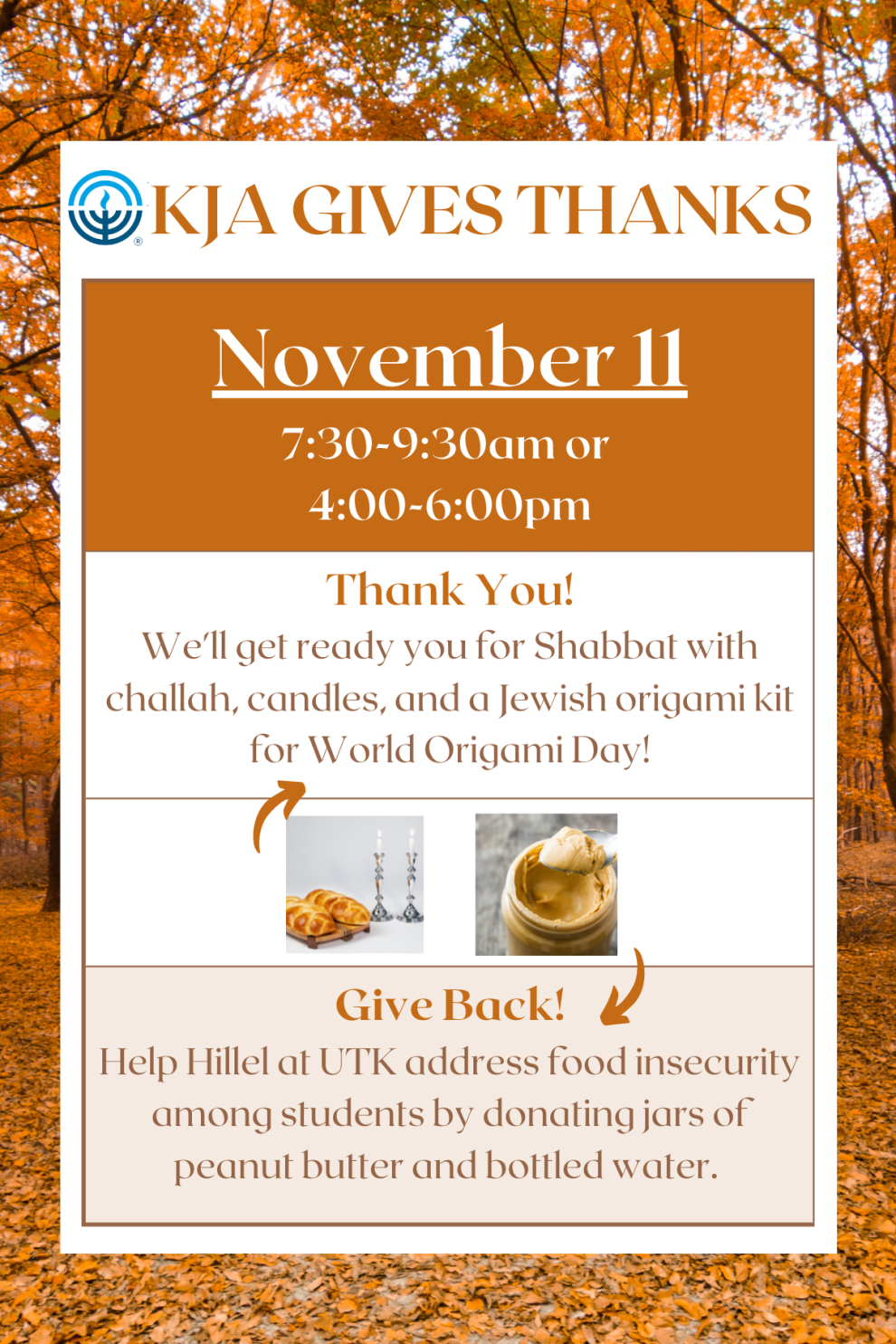 KJA Gives Thanks for YOU! You are the heart of our community and our reason for existing. We are truly blessed to have you as part of our Jewish Knoxville family. In that spirit of gratitude, we invite you to stop by the Arnstein Jewish Community Center on Fridays in November for special treats and opportunities to give back