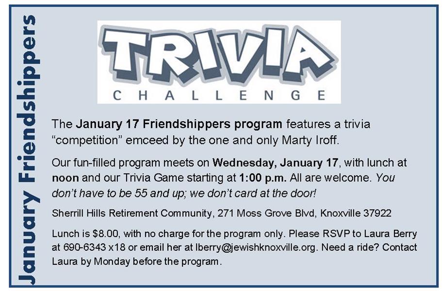 The trivia program that was originally scheduled for January 17 has been moved to Wednesday, February 21. Think good weather thoughts!